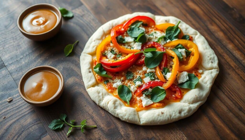 For high-protein toppings, use turkey pepperoni, chicken sausage, or bacon. Grilled chicken or steak adds a hearty touch.