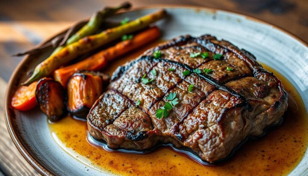 Try our Garlic-Herb Marinated Venison Steaks for a classic grilled deer steak. The mix of garlic, rosemary, and thyme adds a rich flavor to the meat. It’s perfect for your next backyard barbecue.