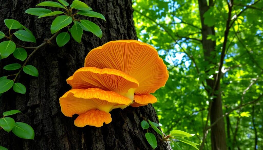 Imagine finding a mushroom that looks and tastes like chicken. This is the Chicken of the Woods, a prized wild mushroom. It’s loved by foragers and chefs for its unique taste and texture.