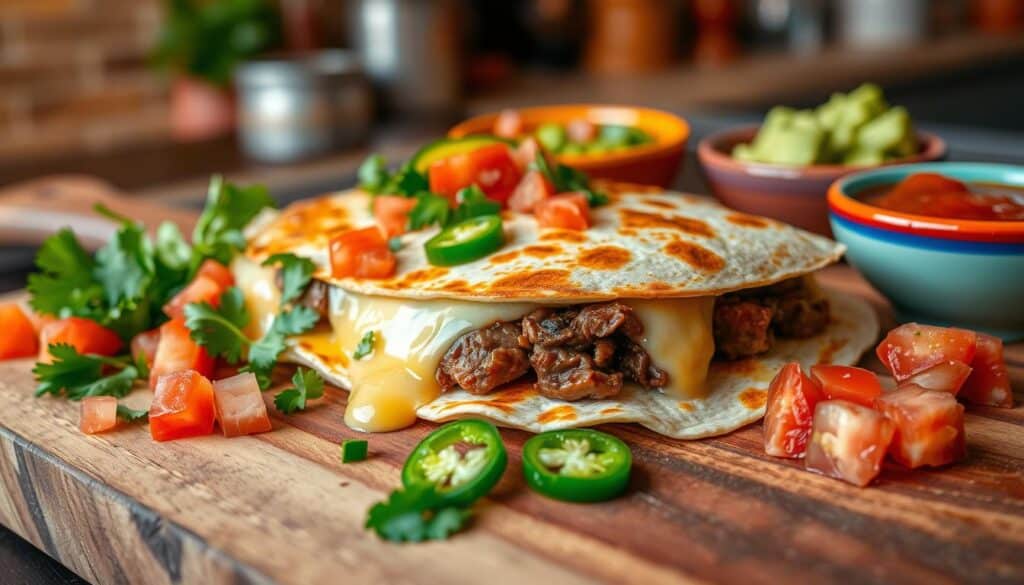 The classic tex-mex steak quesadilla or beef quesadilla is a versatile dish. It can be customized to fit many tastes. The basic ingredients – tender steak, melted cheese, and crisp tortillas – make a great base. But, adding optional toppings and fillings can make it even better.