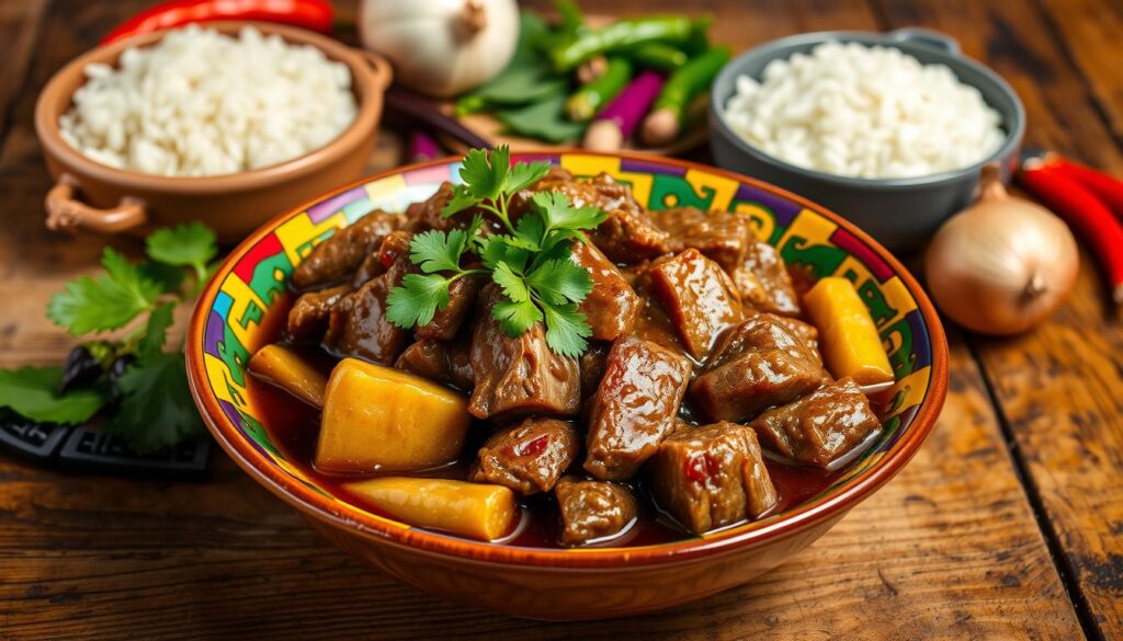 This dish shows Filipino cooks’ creativity and skill. The pork is marinated and then cooked slowly in a flavorful sauce. This makes the meat tender and full of flavor.