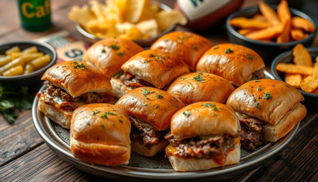 Roast beef sliders are the top choice for game day. They are easy to make, loved by everyone, and save time. This makes them ideal for tailgating and quick meals.