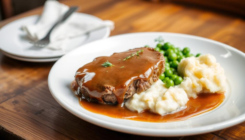 Salisbury steak is a beloved American comfort food. It’s great with many side dishes. The beef patties and mushroom gravy are best over creamy mashed potatoes. This lets the flavors mix well with the potatoes for a great meal.