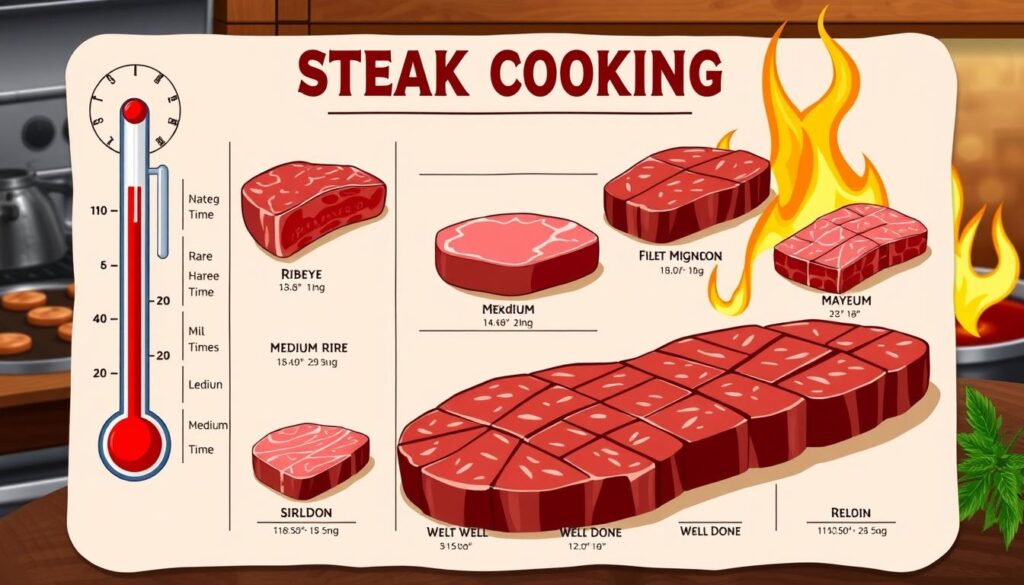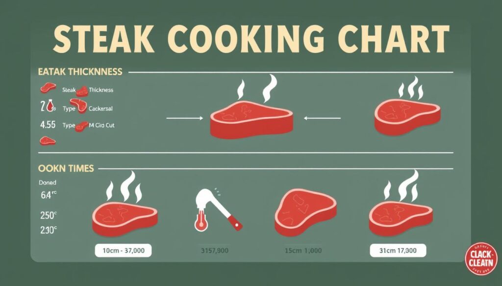 When using a steak cooking chart, consider several factors that affect cooking time. The type of steak, its thickness, and the grill’s heat are key. These elements determine how long your steak will cook.
